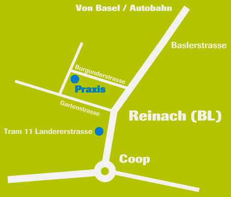 Von Basel: Baselstrasse entlang der Tramlinie 11 in Richtung Zentrum fahren. Vor dem Kreisel beim Coop rechts über die Tramgeleise in die Gartenstrasse abbiegen, und noch